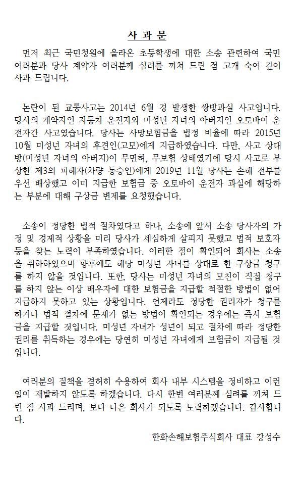 | Subject | 초등생 상대 소송 제기한 한화손해보험 사과 "소송 취하했다" |