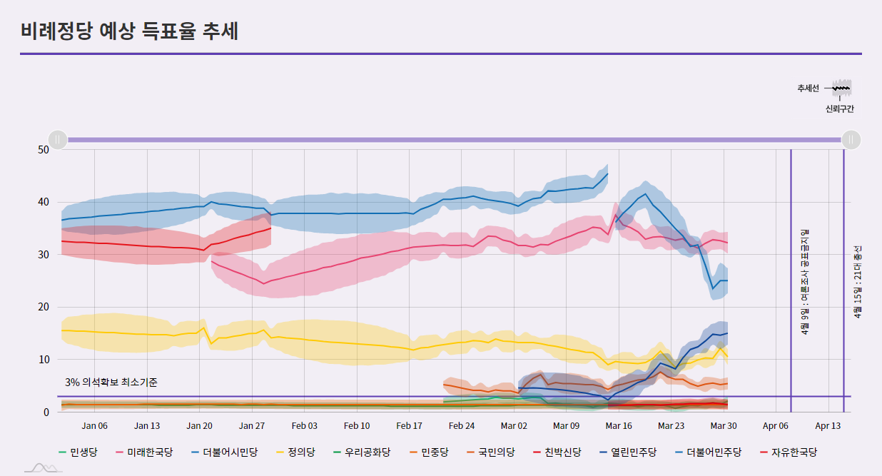 각종 난립하는 여론조사.. mbc가 이 여론조사들을 모아 메타-여론조사 격으로 총선의 지역구-비례 의원 득표율 판세를 나타내는 서비스를 제공합니다.
