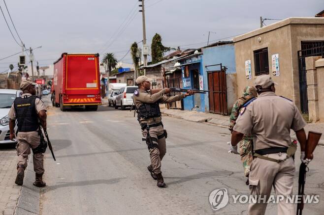 봉쇄령이 내려진 남아프리카공화국 요하네스버그에서 거리를 순찰하는 군경. 집으로 들어가라고 총을 쏘고 있다. [AFP=연합뉴스]