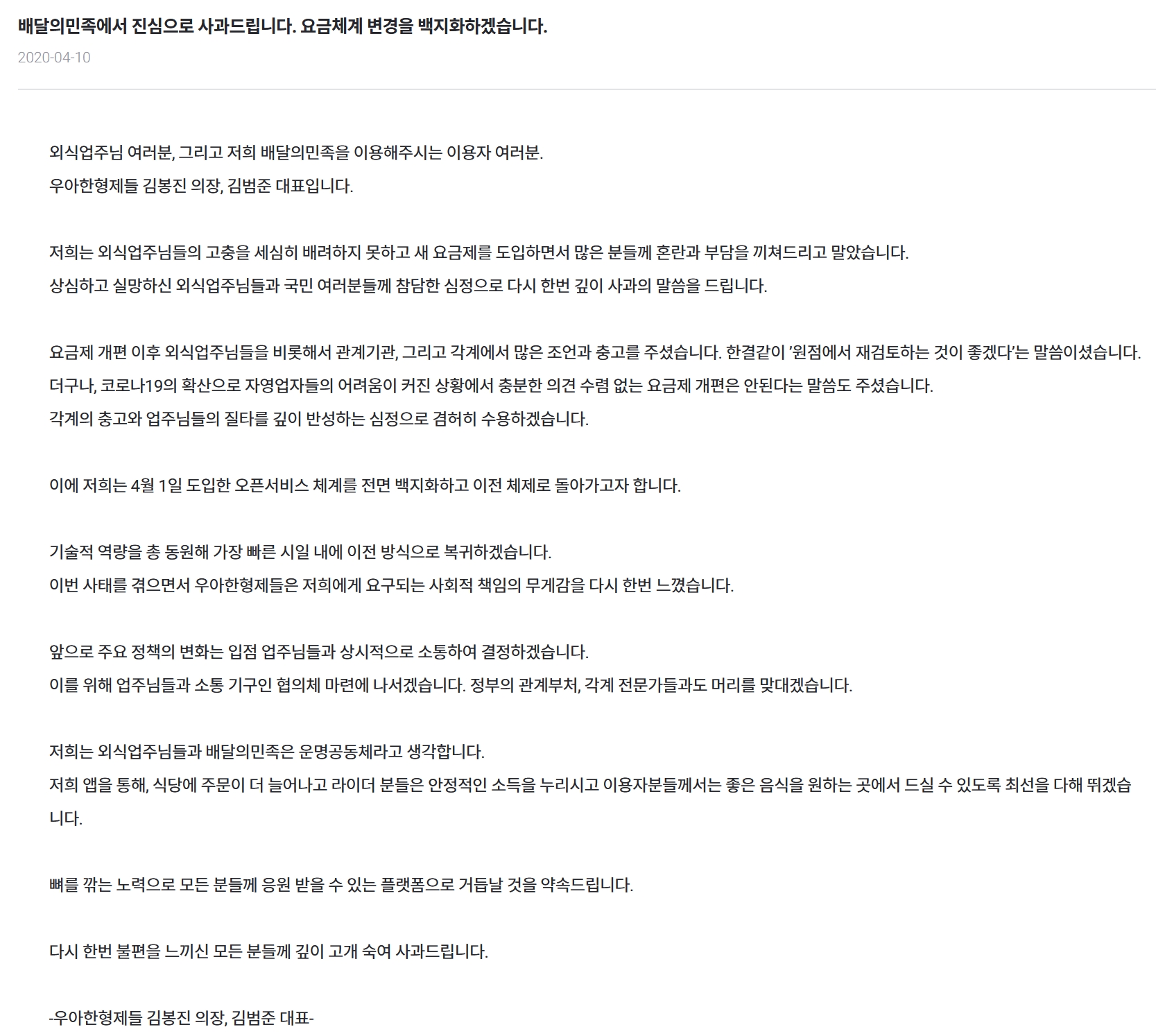 19743 경제배달의민족 "수수료 개편 철회..업주들과 협의체 구성" 8 Schweigen 20/04/10 4344 0