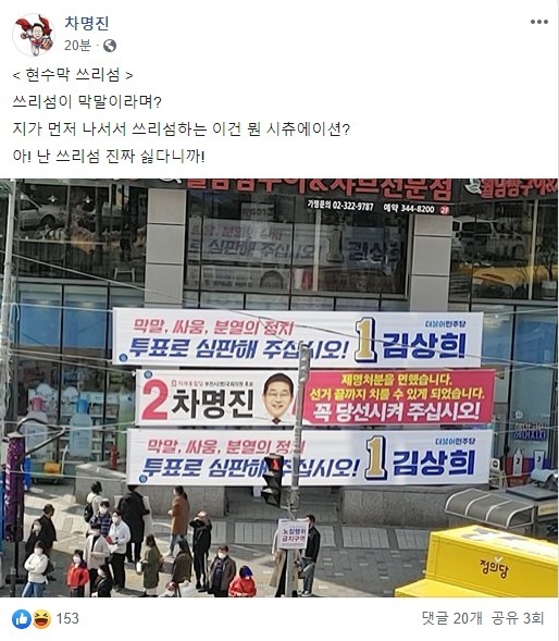 차 후보는 이어 “○○○으로 더럽힌 그대들 세월호 연대 당장 국민에게 사과하고 감옥으로 가라”면서 “통합당 지도부에 요구한다. 세월호 텐트에 있었던 그날의 진상 조사를 당장 실시하라”고 요구했다.