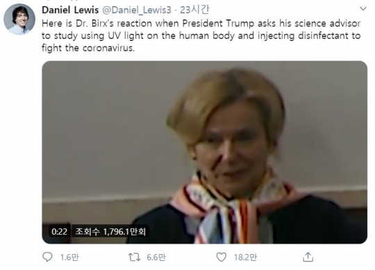 대니얼 루이스 CNN 디지털비디오 프로듀서가 트위터에 올린 영상이다. 데보라 벅스 미 백악관 코로나19 태스크포스 조정관이 지난 23일(현지시간) 도널드 트럼프 대통령의 이른바 ‘살균제 인체 주사’발언이 나왔을 때 충격을 받은 듯 깊은 호흡을 2번 가량하는 모습이 담겨 있다.