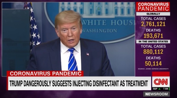브리핑 축소안은 트럼프 대통령의 이른바 ‘살균제 인체 주사’ 발언 이전부터 거론되던 건데, 여론 악화가 급속히 진행하는 점을 결국 스스로 깨닫게 될 것이라는 관측이다.