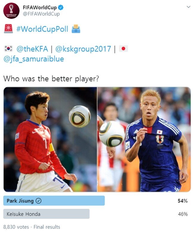 | Subject | FIFA 투표 최종결과 박지성 54% vs 혼다 46% |