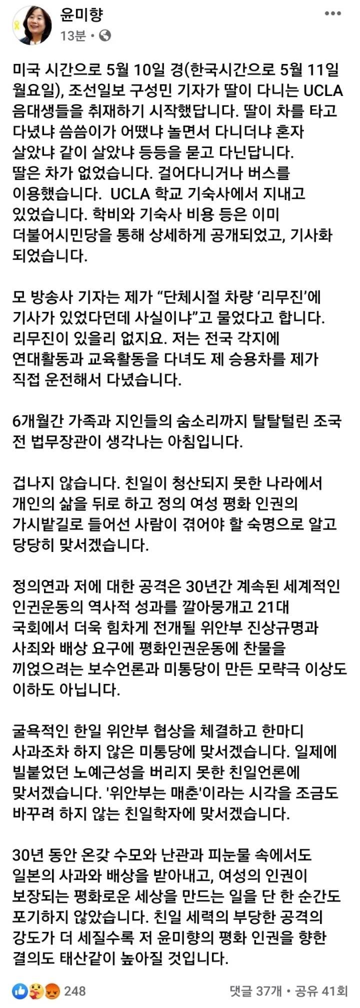 | Subject | 이나영 정의연 이사장 "외부 회계 감사 안 받겠다" |