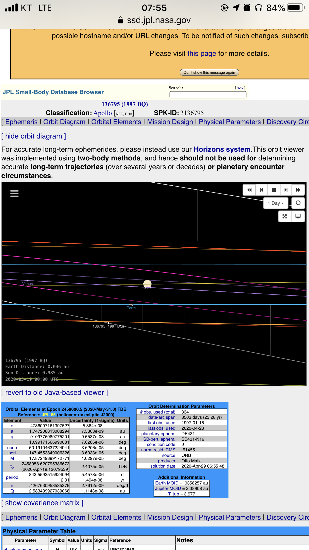 소행성의 크기는 지름 670m(미터)~1.5km(킬로미터) 사이로 추정되며 초당 11.68km, 시속 4만2047km로 이동하고 있다고 나사는 설명했다. 이 소행성은 1997년 1월 16일 일본 국립 천문대에서 관측된 것으로 당시 136795 (1997 BQ)라는 이름이 붙었다.