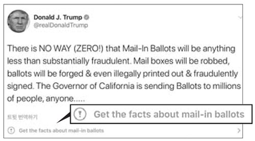 이번 행정명령을 불러온 직접적인 사건이 터진 건 지난 26일이다. 트위터 측이 '우편 투표가 부정 선거를 부를 수 있다'고 비난한 트럼프의 트윗에 "팩트를 확인하라"는 '경고' 문구를 붙인 것이다. 이달 초부터 '오해를 부를 수 있는 정보'에 대해 경고 문구를 넣는 정책을 실시한 데 따른 것이었다.
