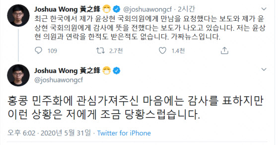 https://news.v.daum.net/v/20200531225451008 31일 뉴스1에 따르면 윤 전 위원장은 이 매체와의 통화에서 “제3자가 조슈아 웡과의 화상 인터뷰를 요청해와서 정중히 거절한 것이 전부”라며 “(조슈아 웡이 언급한) 가짜뉴스 등은 해프닝이고 오해다. 의사소통의 문제가 있었던 것 같다”고 말했다. 조슈아 웡 측에서 화상 인터뷰 요청이 있었던 것은 사실이지만 당사자에게 전달되지 않았다는 게 윤 전 위원장의 설명이다. 한편 조슈아 웡은 이날 자신의 트위터 계정에 “저는 윤 전 위원장과 연락을 한 적도 받은 적도 없다”며 “가짜뉴스”라고 적었다. 그러면서 “홍콩 민주화에 관심을 가져주신 마음에는 감사를 표하지만 이런 상황은 저에게 조금 당황스럽다”고도 했다. 조선일보가 다음의 뉴스를 냈는데, 이것이 가짜뉴스라는 소리입니다. [단독] 조슈아 웡 "홍콩 민주주의 우려 밝혀준 윤상현에 감사" - 조선일보 https://news.v.daum.net/v/20200530195351417 홍콩의 민주화 투사 조슈아 웡 데모시스토당 사무총장 측은 30일 윤상현 전 국회 외교통일위원장에게 “홍콩 국가 보안법에 대한 입장을 표명해준 데 대해 감사한다”며 “윤 전 위원장이 한국 국회에서 유일하게 이번 홍콩 보안법 통과로 인한 민주주의 훼손에 대한 공개 우려를 밝혀준 점에 대해 고맙게 생각한다”는 뜻을 전해왔다고 윤 전 위원장이 이날 밝혔다. 홍콩이 어찌되었든 우리나라가 관여할 바가 아닌데 괜히 이곳저곳 들쑤시는 게 좋은 일이 아니겠지요. 한국 언론이 한국에게 혹여나 해가 될 수도 있는 가짜뉴스를 만들면 안되겠습니다. 0