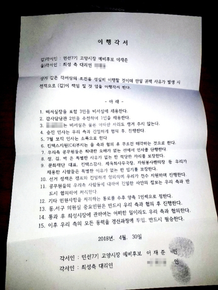 | Subject | 민주당 고양시장 경선 때 캠프 간 ‘이행각서’ 사실로 |
