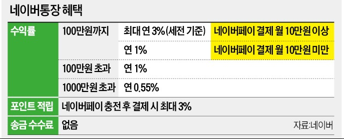 네이버통장의 수익률은 네이버페이(모바일 간편결제 서비스) 전월 결제액과 통장 보유액에 따라 달라진다. 네이버페이 전월 결제액이 10만원 이상이면 100만원 한도 내에서 연 3%, 100만~1000만원까지는 연 1%, 1000만원 초과시 연 0.55%가 적용된다. 네이버페이 전월 결제액이 10만원 미만이면 1000만원 한도 내에서 연 1%, 초과시 0.55%가 적용된다. 다만 오는 8월까지는 통장 출시 기념으로 구매 실적 조건 없이 100만원 한도 내에서 연 3% 수익률을 제공한다.