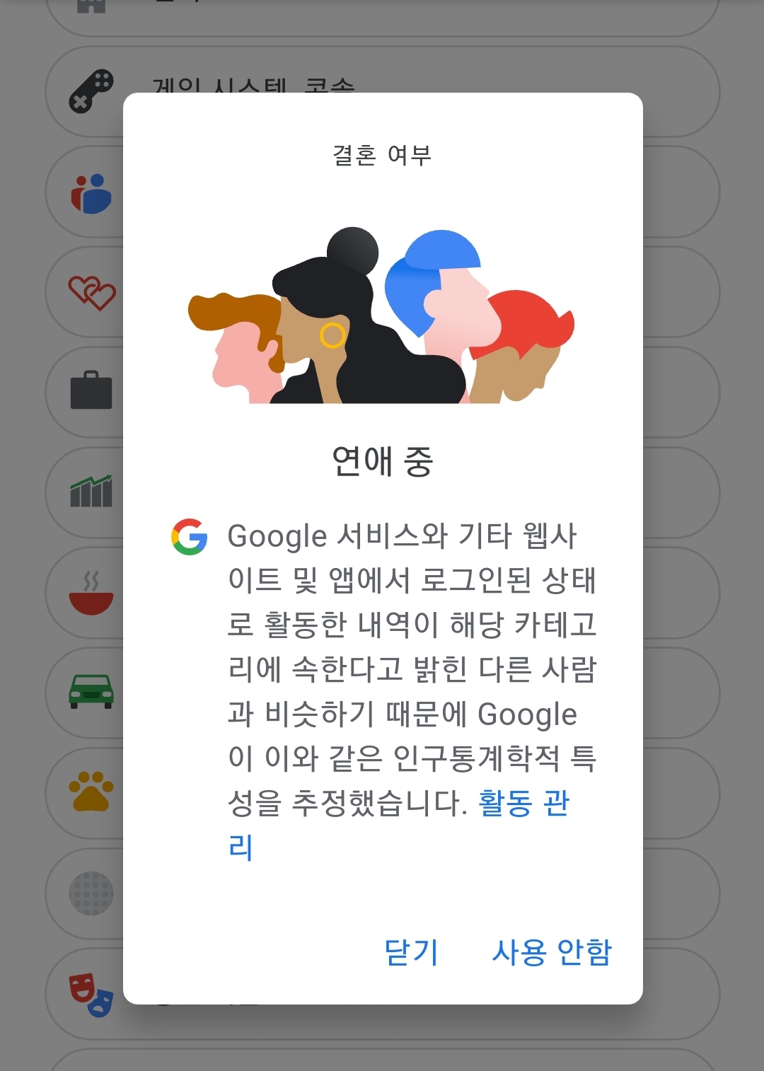 구글은 이에 대해 "로그인된 상태로 활동한 내역이 이러한 카테고리에 속한다고 밝힌 다른 사람과 비슷하기 때문에 인구통계학적 특성을 추정할 수 있다"고 설명한다. 당신이 '연애중'이라는 카테고리에 속하는 무수한 이용자들과 비슷한 행동 패턴을 보이면 해당 범주에 포함돼 맞춤광고에 노출된다는 얘기다. 광고주는 누구에게 광고할지 고민할 필요가 없다. 인공지능이 해당 분야에 관심있을 만한 사람을 알아서 찾아낸다. 이용자가 많을수록, 이용자 데이터가 많이 수집될수록 추정 값은 정확해진다. 이 원리를 이해하기 위해서는 데이터의 '양'이 얼마나 중요한지 알 필요가 있다. (..)