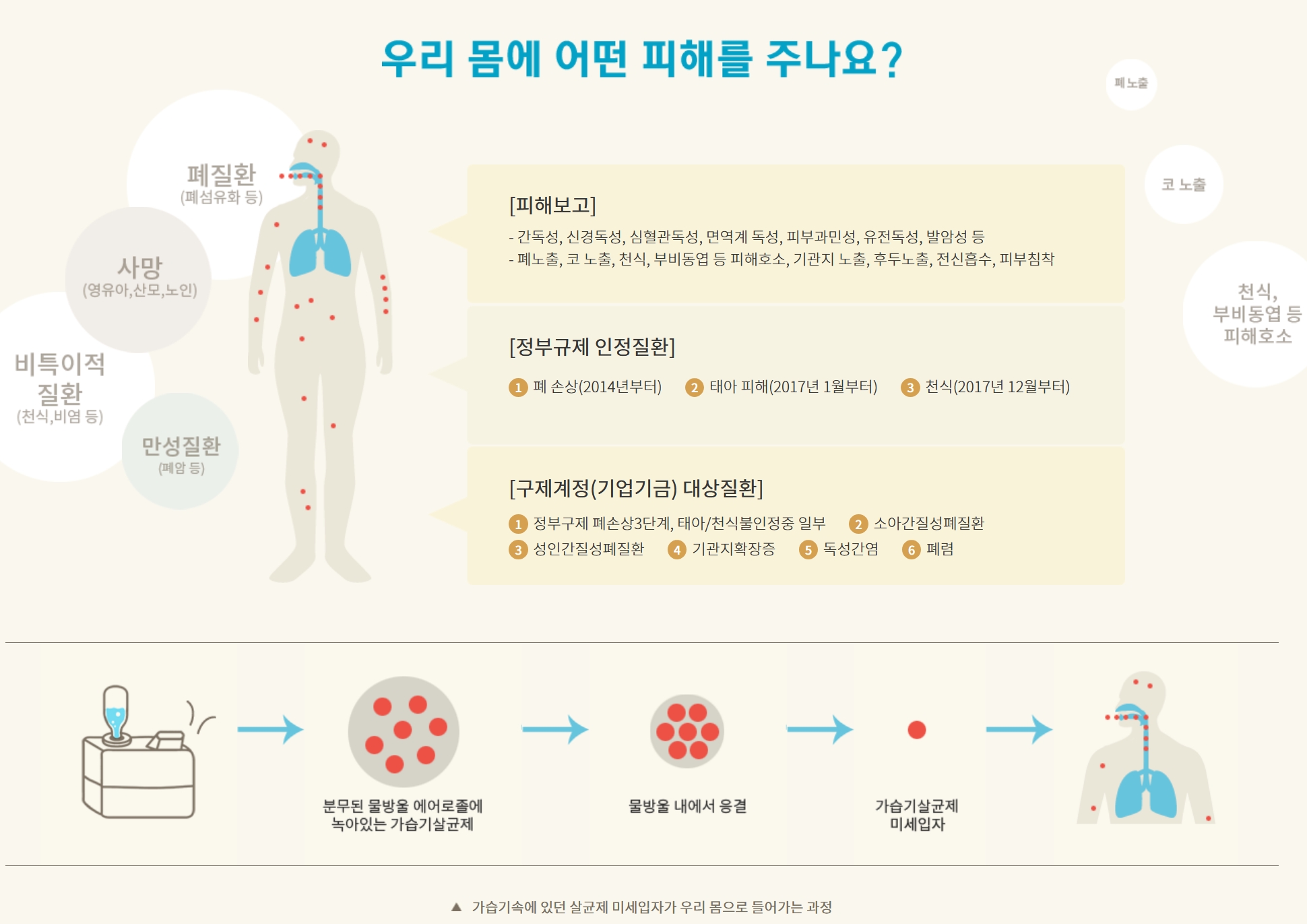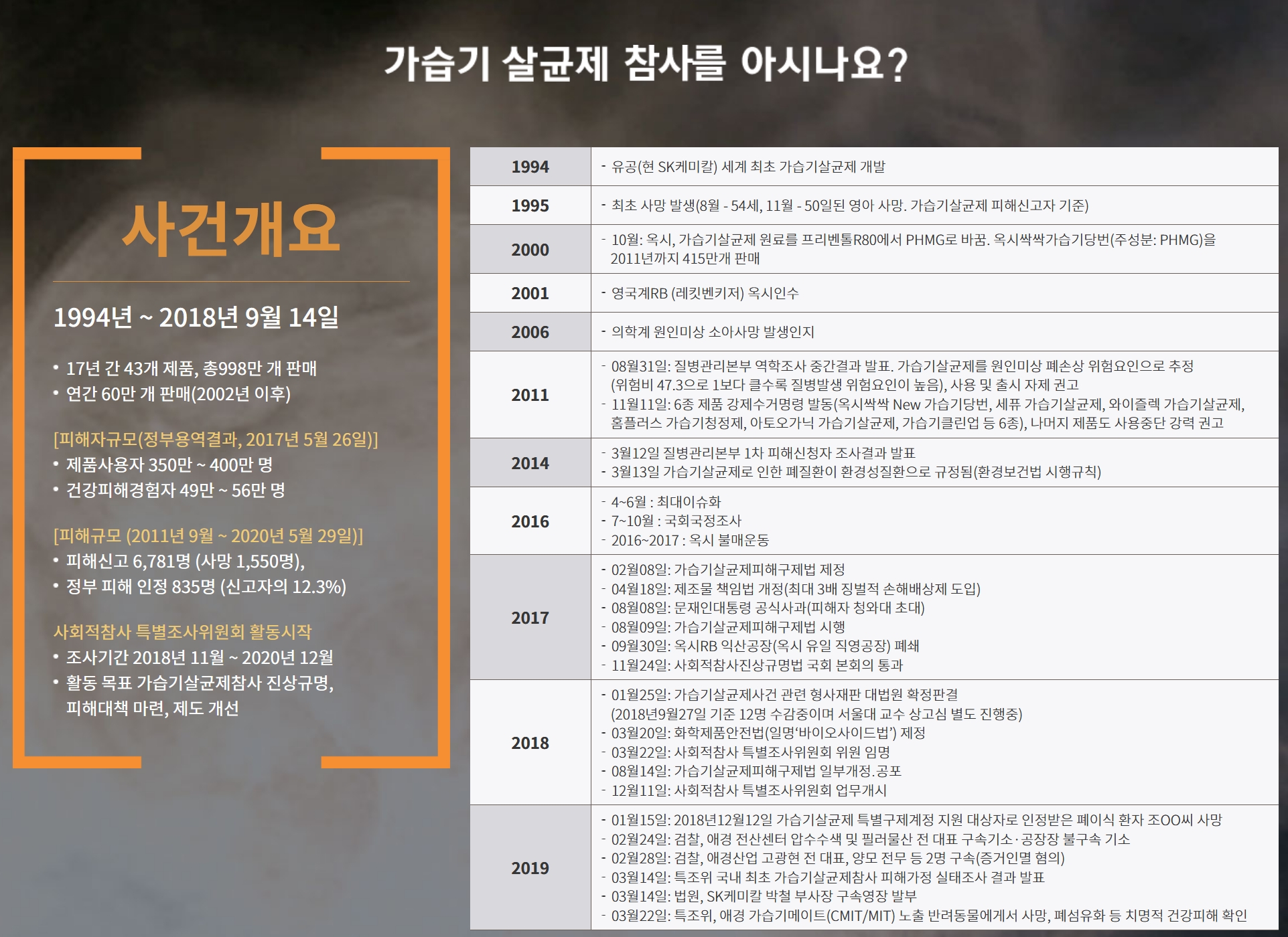 https://www.yna.co.kr/view/AKR20200629082100004 http://socialdisasterscommission.go.kr/news/report/Read.jsp?ntt_id=3773 피해자로 분류되고, 제대로 보상을 받는 것까지는 기존 가습기 살균제 건들을 봤을 때 쉽지 않을 것 같습니다만. 10년 넘어서 이런 것도 공식 조사가 되기는 하군요. 가습기살균제류가 가정뿐 아니라, 군부대, 병원 등에서도 광범위하게 쓰였고, 공식 사망자만 1,500명이 넘는데, 실제 피해자는 얼마나 될지... 1