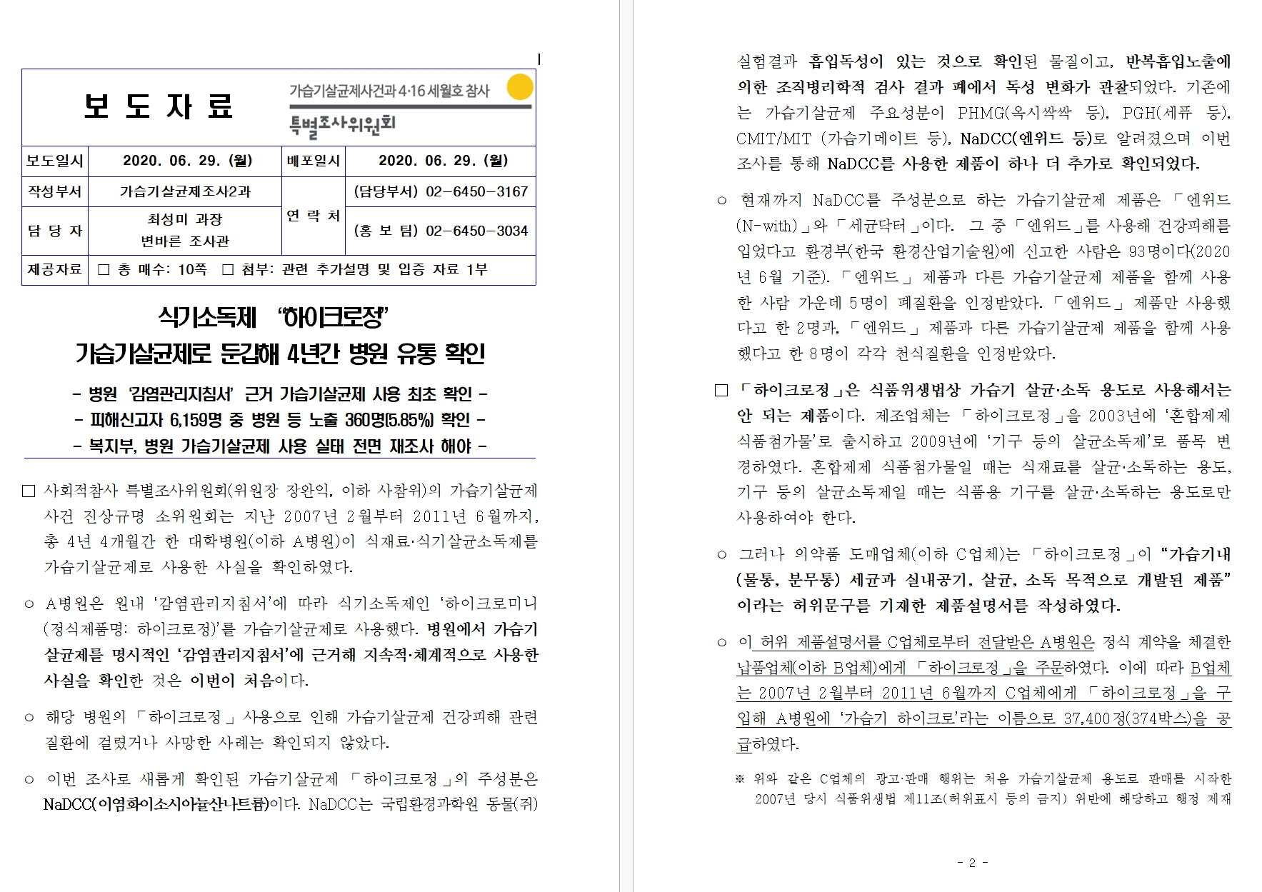 | Subject | 사참위 "대학병원서 식기세척제를 가습기살균제로 4년 썼다" |