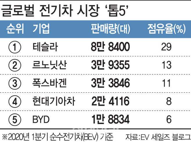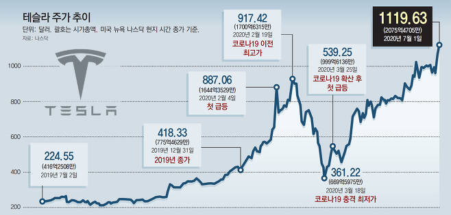 글로벌 자동차 업계가 신종 코로나바이러스 감염증(코로나19)으로 인한 생산 중단과 판매량 부진에 허덕이는 사이 투자자들은 미래차를 앞세운 테슬라로 돌아섰다. 올해 초 약 430달러였던 주가는 이날까지 3배 가까이로 뛰었다.
