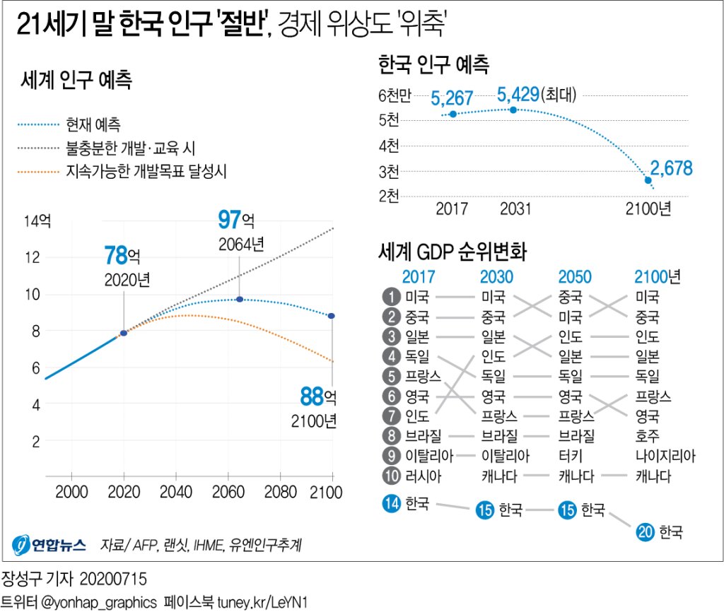 21013 사회한국 인구 세기말에 반 토막…경제순위는 20위로 하락 14 메오라시 20/07/15 3755 0