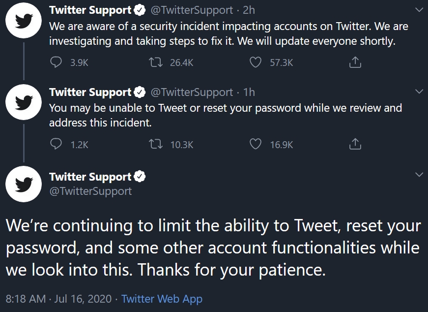 이와 관련해서 트위터 측에서 밝히기는 비밀번호 변경이나 트윗 기능 등을 잠그기도 했다고 합니다. (인증된; 계정 옆에 체크 마크 달린 계정 위주인 것 같습니다.)