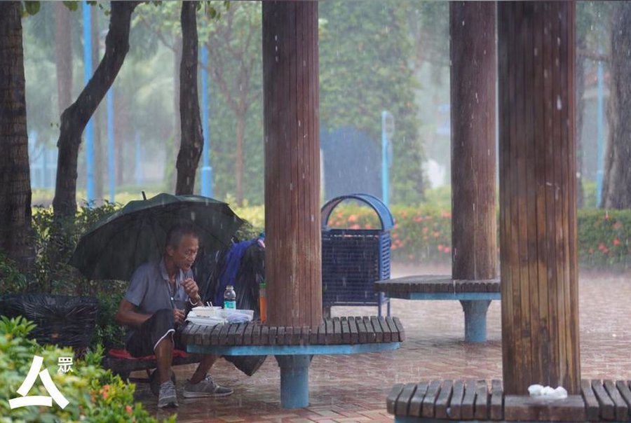 사진은 우중에 공원에서 우산 쓰고 밥 먹는 홍콩의 풍경.