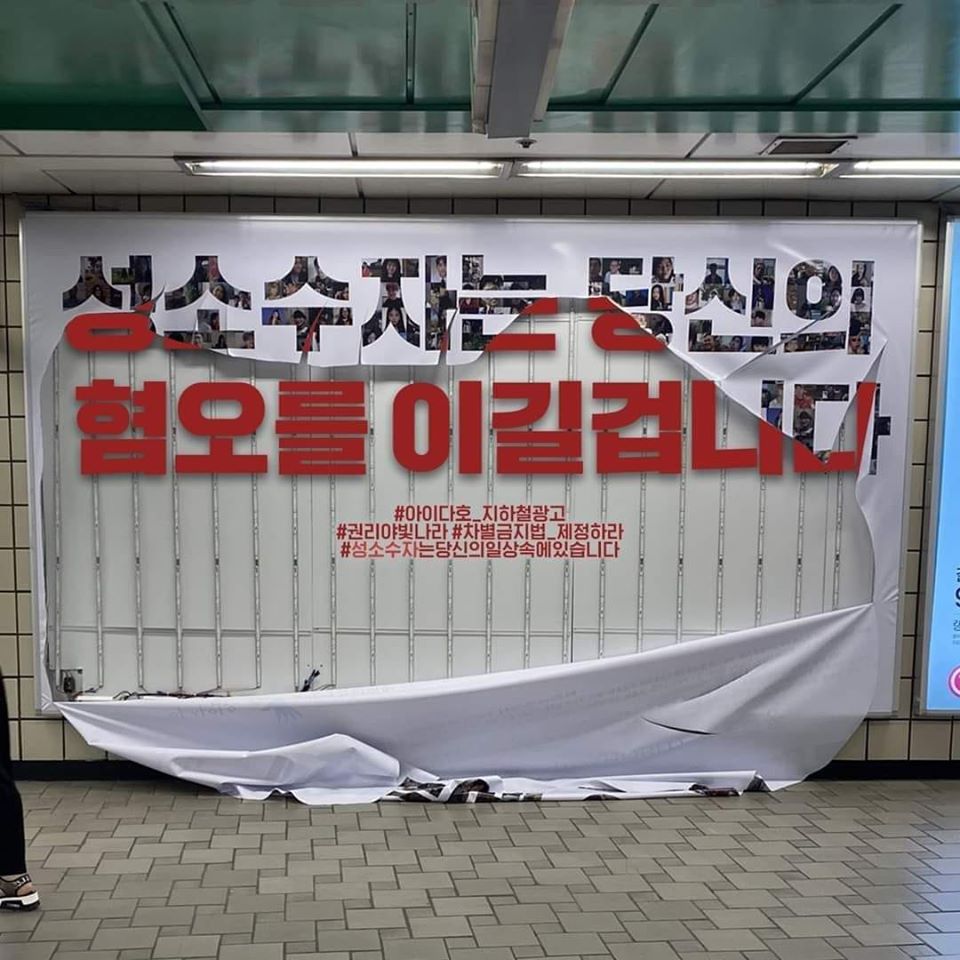 | Subject | 신촌역 '성소수자 차별 반대' 지하철 광고 이틀 만에 훼손 |