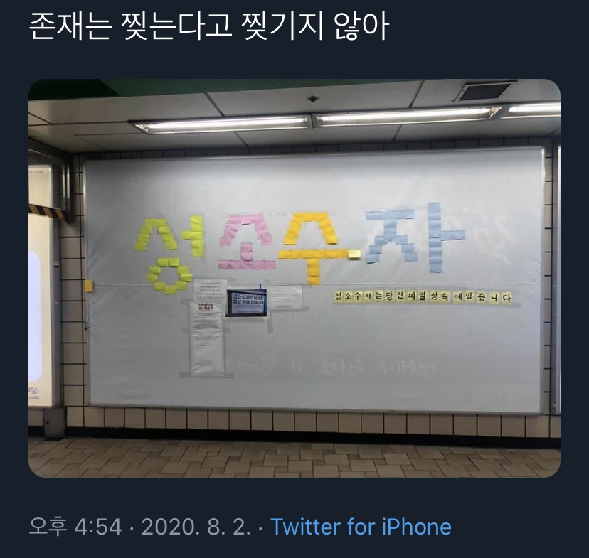 https://news.v.daum.net/v/20200802155721640 성소수자차별반대 무지개행동에 따르면 지난달 31일 게시됐던 '성소수자는 당신의 일상 속에 있습니다'는 광고는 게시 이틀 만에 심하게 훼손된 채 이날 오전 발견됐다. 지금은 전체글 삭제했지만 옆동네에세 예전에 이런 쪽지를 받았어요. 성소수자 관련 게시물을 올리고 코멘트를 남겼던 날이었죠. 니 게이인거 아니까 XXXX 나대라. 아마 이 사건과 결이 같을 겁니다. 썸타고 연애하고 시월드 처가살이 이혼 외도 불륜.... 이야기는 되지만 그 앞에 저같은 사람이 붙으면 나대는게 되지요. 4