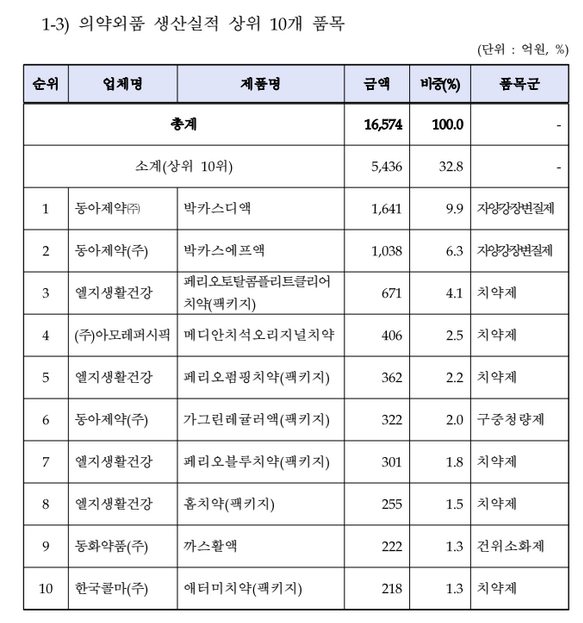 생산 기준으로는 까스활명수큐액이 1위입니다.