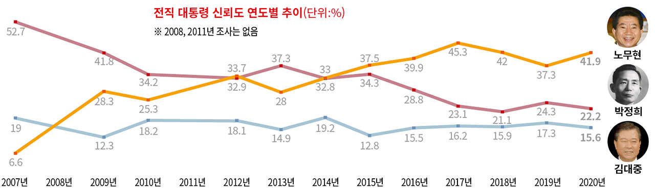 https://www.sisain.co.kr/news/articleView.html?idxno=42965 [2020년 전직 대통령 신뢰도 조사에서 3위(15.6%)를 차지한 김대중 전 대통령은 2007년 전직 대통령 신뢰도 이후 꾸준히 10% 중반대를 유지하며 3위 자리를 고수하고 있다. 노무현 전 대통령을 신뢰한다고 응답한 비중이 높은 40대(67.5%)가 김대중 전 대통령 신뢰 응답에서는 낮은 비율(9.4%)을 보여 대조를 이뤘다. 이명박 전 대통령의 신뢰도 상승도 눈에 띈다. 비록 한 자릿수이지만 지난해 2.9%에서 4.8%로 올랐다. 노무현-박정희-김대중에 이어 4위다. 상승세를 이끈 세대가 20대라는 점도 눈여겨볼 대목이다. 20대 14.2%가 이명박 전 대통령을 신뢰한다고 밝혔다. 박정희 전 대통령을 신뢰한다고 밝힌 20대 비율(7.7%)보다 높다. 게다가 이명박 전 대통령을 신뢰한다고 말한 20대의 응답 성향은 40대 이상과 확연히 차이가 난다. 30대 6.1%, 40대 1.5%, 50대 2.4%, 60대 이상 2.3%가 이명박 전 대통령을 신뢰한다고 대답했다.] --------------------------------------- 비상이라길래 ??이러며 봤는데 ㅋㅋ 추락과 대비해서 봤어야했는데 말이죠ㅋㅋ 20대의 이명박 평가는...박정희의 분신이었던 박근혜는 패배의 책임자고, 원조 가카 박정희는 교과서속 사람이고, 가까운 안티테제로써 이명박아닐지. 개인적으로는 YS가 눈에 밟히는군요. IMF가 참 크긴 크네요. 이명박 아래ㅠㅠ 그래프 보면 노무현, 박정희 보담도 꾸준한 DJ의 위엄이 느껴지기도하고. 0