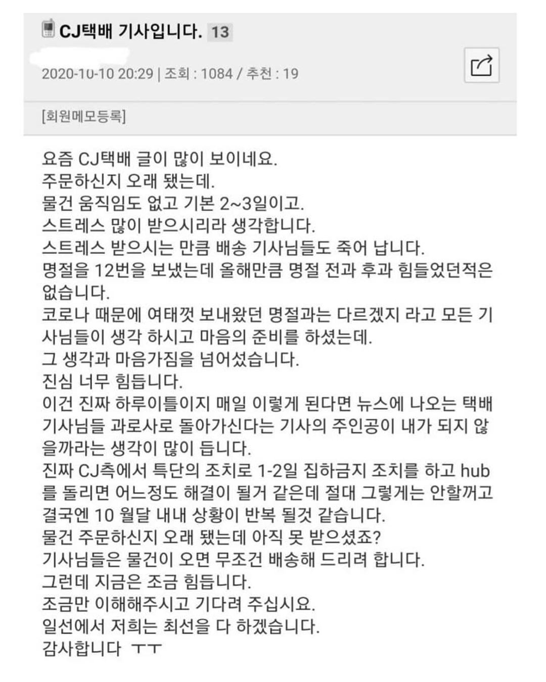 22003 사회택배기사 또 다시 배송 중 사망…택배기사 과로사 올해 8번째 11 구밀복검 20/10/12 4067 12