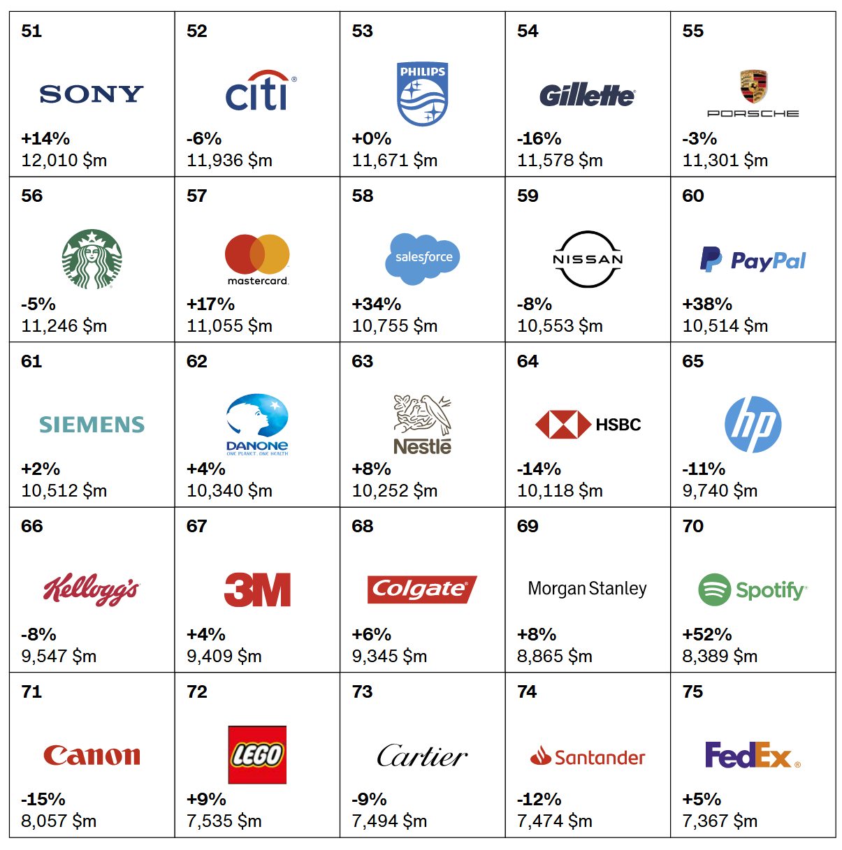 아마존(3위)이 브랜드 가치평가액(60% 증가)으로는 가장 크게 점프했습니다.  스포티파이(70위)와 넷플릭스(41위), 인스타그램(19위)가 순위 점프는  크게 했습니다.