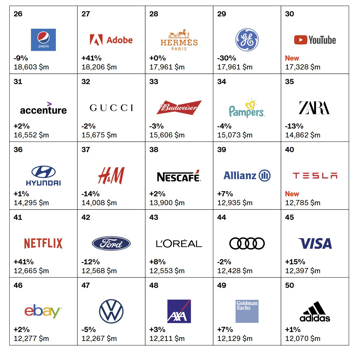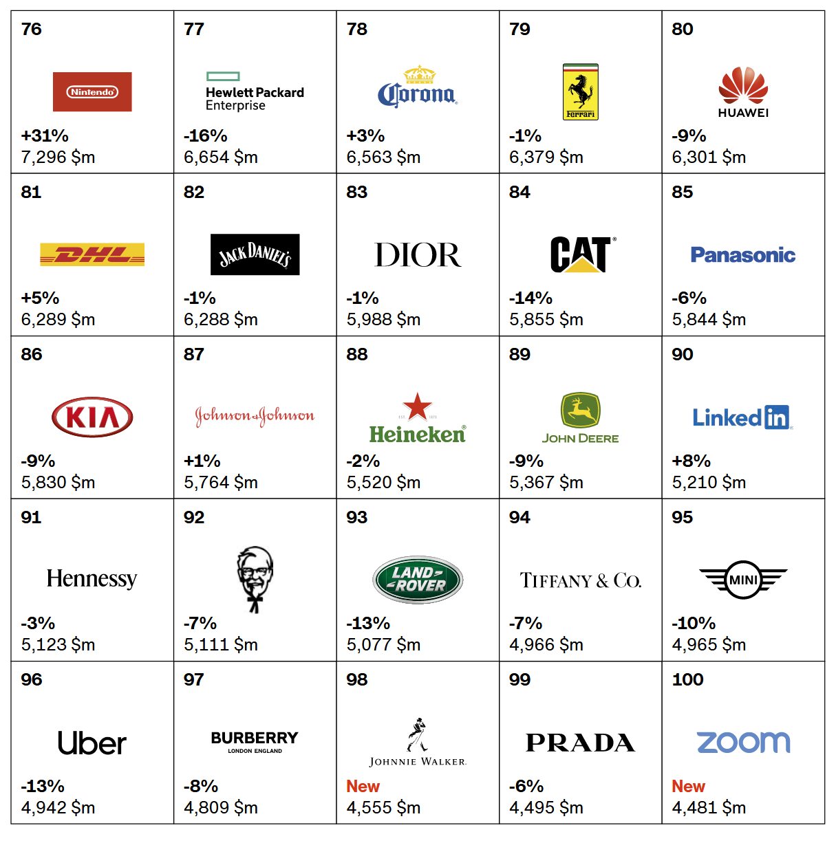 인스타그램이 19위, 유튜브가 30위, 줌이 100위로 처음 100위권에 입성했고, 테슬라가 40위, 조니 워커가 98위로 다시 순위권에 복귀했습니다.