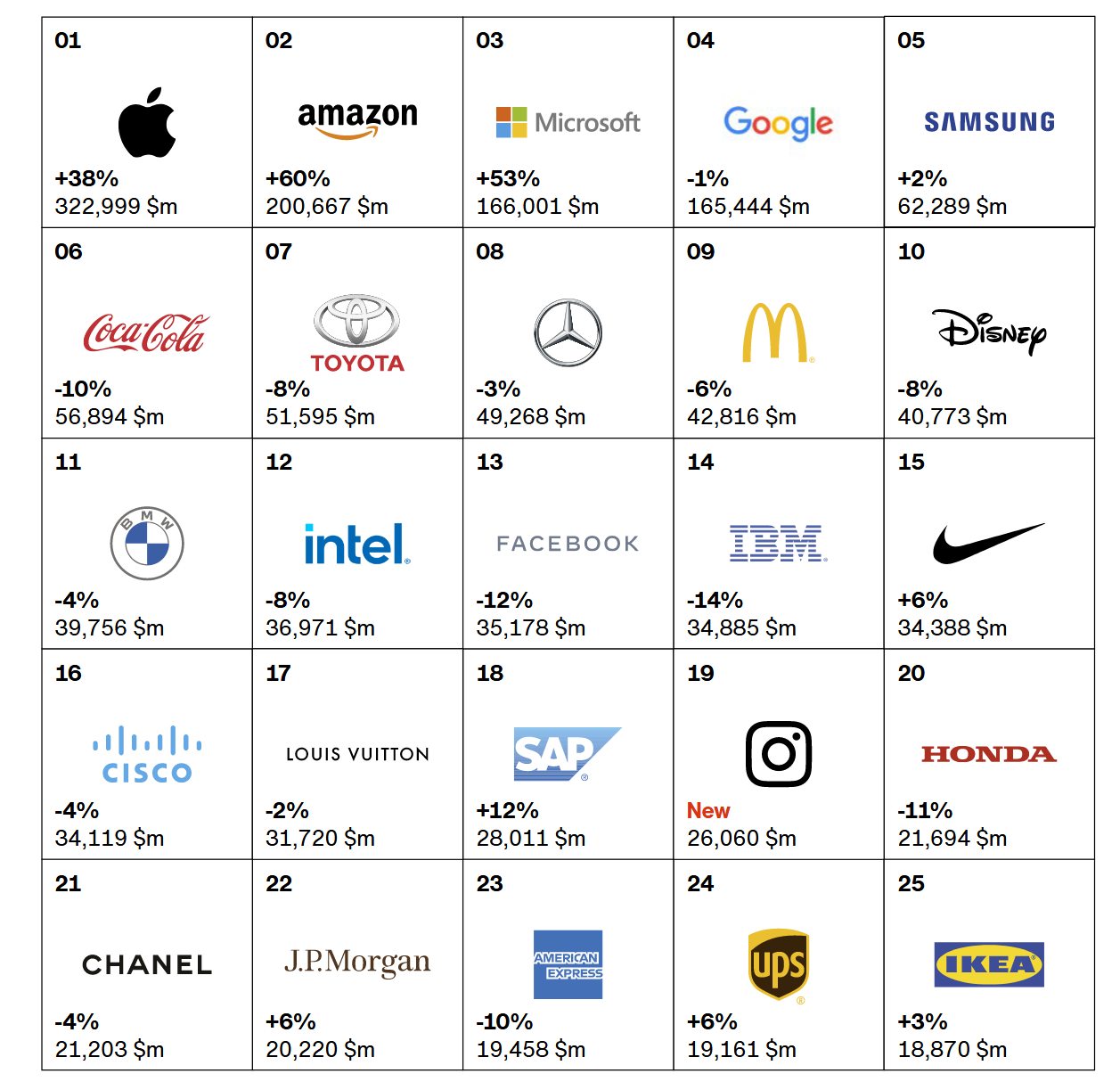 10위까지는 테크 기업들이 애플, 아마존, 마이크로소프트 순으로 1, 2, 3위를 하며 과점했고, 상대적으로 코로나19 여파인지 소매 브랜드들은 주춤/뒷걸음질했습니다. 마이크로소프트는 구글(4위)을 잡았습니다.