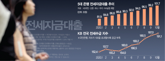 https://www.sedaily.com/NewsView/1ZABTV12SO 5대 은행 : KB, 신한, 하나, 우리, 농협 올해 1월에만 해도. 5대 은행의 전세자금 대출 금액을 합해서 81조였습니다만 10월 기준으로 100조를 넘기는.. 9개월만에 '25%' 나 증가하는 엄청난 속도의 전세자금 대출 상승폭을 기록했습니다. 전세자금 대출이 큰 폭으로 상승한 이유는 역시나 '순수하게 전세값이 폭등' 하면서 대출액이 같이 폭등한것으로 파악된다고 합니다. 전국 전세수급 지수의 경우 19년 2개월만에 최대치인 191.1 을 기록했습니다만 전세수급은 역사적으로도 공급폭탄이나 집사세요. 2가지 중 하나로 해결을 했습니다마 현재는 둘 다 없는 상태여서.. 정부에서도 해법을 현재 찾지 못하고 있는 것으로 보입니다. (계속해서 대책 발표가 뒤로 가고 있는 상태) KB지표가 아닌 한국감정원 기준으로도 한국감정원이 발표한 ‘2020년 10월 전국주택가격동향조사 결과’에 따르면 지난달 12일 기준 전국 월간 주택종합(공동주택·다세대연립·단독다가구) 전세가격은 0.47% 올랐다. 이는 지난해 같은 달 전국 전셋값 상승률(0.09%)을 크게 웃도는 수준이다. 지난해 같은 달 대비 5배가 넘는 지표를 기록하고 있습니다. 또한 전세자금 대출 규모가 100조를 넘어가면서, 5대 은행에서도 전세자금대출에 대해서 우리은행을 선두로 제한을 하기 시작하는것으로 보입니다. (건전성 관리) 0