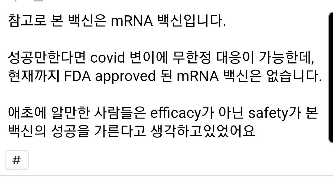 이번 임상시험을 통해 단기적으로 나타나는 부작용은 적다고 추정할 수 있으나, 장기적인 측면에선 잘 모르긴 하지요. 그래도 기전만을 놓고 본다면, 안정적일 것이라 생각합니다.