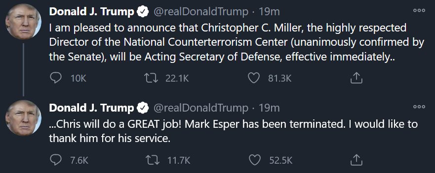 Subject   트럼프, 에스퍼 국방장관 전격 트윗 경질…대행 발표
