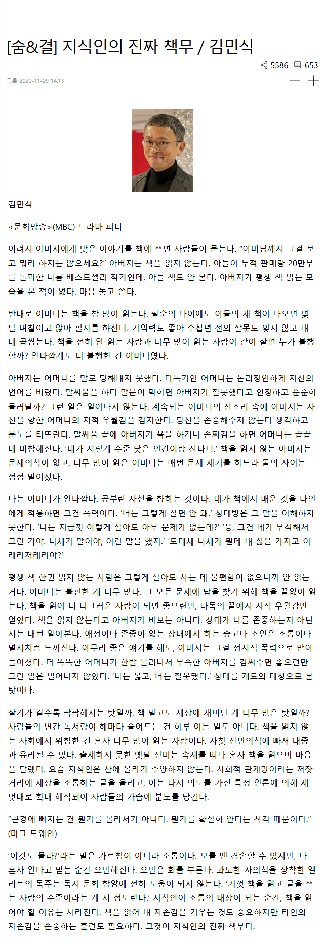 http://www.mediatoday.co.kr/news/articleView.html?idxno=210252 김민식 MBC PD는 10일 한겨레 정기기고 코너 ‘숨&결’에 ‘지식인의 진짜 책무’란 제목의 칼럼을 기고했다. 김 PD는 어린 시절 자신의 아버지가 어머니에게 폭력을 휘두르던 상황을 묘사하며 글의 주제의식에 빗댔다. 김 PD는 기고에서 자신의 어머니는 아버지와 달리 독서량이 많았다고 밝힌 뒤 “계속되는 어머니의 잔소리 속에 아버지는 자신을 향한 어머니의 지적 우월감을 감지한다. 당신을 존중해주지 않는다 생각하고 분노를 터뜨린다. 말싸움 끝에 아버지가 욕을 하거나 손찌검을 하면 어머니는 끝끝내 비참해진다”고 썼다. http://www.hani.co.kr/arti/opinion/column/969146.html <한겨레>는 10일치 26면에 실린 김민식 피디의 칼럼 ‘지식인의 진짜 책무’가 가정폭력의 원인을 피해자에게 전가하는 것으로 비칠 수 있는 부적절한 내용임에도 걸러내지 못했습니다. 외부 필진의 글은 되도록 원글을 존중하는 원칙을 갖고 있으나 이번 경우 그런 이유가 변명이 될 수 없을 것입니다. 특히 독자들의 지적이 있기 전까지 내부에서 이를 충분히 인식하지 못한 데 대해 심각성과 책임을 느낍니다. 한겨레와 필자의 사과문을 온라인에 게재하고 칼럼은 삭제했습니다. 비슷한 일이 재발하지 않도록 시스템을 정비하고 독자들의 의견에 좀더 귀 기울이겠습니다. 다시 한번 깊이 사과드립니다. 한심하네요 그저. 필진 체면 챙겨준답시고 모르쇠하다가 부랴부랴.. https://twitter.com/wintersoundbook/status/1325983469755756545 삭제된 기고문 6