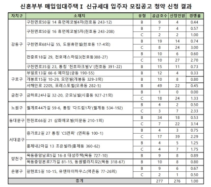 http://naver.me/xhsw942i 정부에서 야심차게 공급한 매입임대 청약이.. 미달이 났습니다 -.-; 그나마 구조 괜찮고, 위치 괜찮은 곳에 한해서 2대1~3.14대1.. 의 경쟁률이 나와서 총합으로 277세대중 276세대.. 로 1세대 미달이 되었을뿐.. 정부가 공급하는 임대주택의 현실을 보여주고 있지 않나 싶네요.. 0