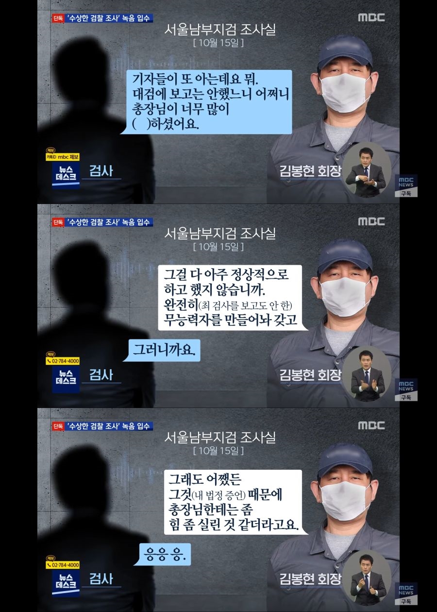 하지만 이 보도를 놓고 최 검사는 '그럴 리가 없지 않냐'는 언급을 하고, 김 회장은 속속들이 아는 듯 맞장구를 칩니다.