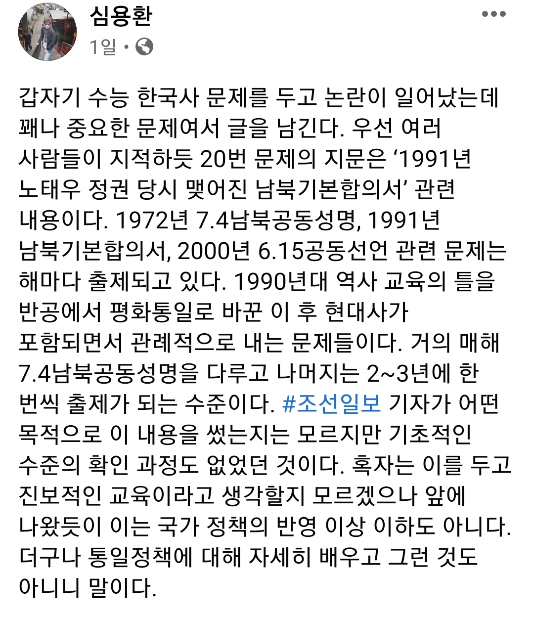 조선일보는 이후 “중학생도 안틀릴 한국사 20번 논란…수능 문제인지 통일교육인지”라고 제목을 수정하고 '문재인'도 '노태우'로 바로잡았다. 하지만 노태우 정부가 채택한 남북 기본 합의서는 대한민국의 남북관계 개선의 시작을 알린 사건이자 민주화 이후 역대 정부의 대북정책 기초가 되어왔다는 점에서 ['통일교육'이라는 비아냥도] 기자와 매체의 무지함을 드러낸다.