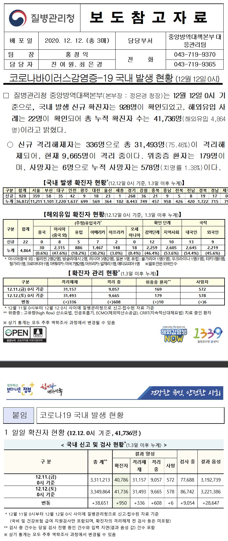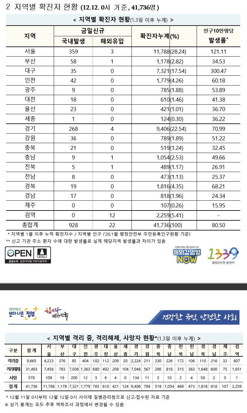 코로나바이러스감염증-19 국내 발생 현황 (12월 12일 0시)