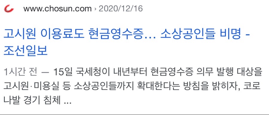 https://news.v.daum.net/v/20201215202944770 원제는 소상공인 비명이었다 욕 오지게 처먹고 소상공인 불만으로 바꿨습니다. 내년도부터 의무발행에 포함되는 업종은 구체적으로 미용실(두피 관리 포함), 의류 소매업, 신발 소매업, 통신 기기 소매업, 컴퓨터·주변장치·소프트웨어 소매업, 반려동물·용품 소매업, 독서실, 고시원, 철물·난방용구 소매업이다. 여기에 이 업종들의 온라인 쇼핑몰도 포함된다. 사업자 수로는 70여만명이다. 다들 아시는거라 구지 설명하는게 웃기지만 현금영수증은 의무발행업종이든 아니든 연매출 2400만원 이상 업장은 소비자가 원할경우 발급을 거절할 수 없습니다. 바뀌는 점은 기존에 10만원 이상이더라도 손님이 요구하지 않으면 발행하지 않아도 되었으나 내년부터 무조건 발행해야 한다는 차이점이 있겠지요. 이 기사의 문제점은 소상공인들은 탈세를 한다를 전제로 작성되었다는 것입니다. 탈세를 해오지 않았다면 의무발행 업종이 되던말던 달라지는 건 하나도 없습니다. 또한 현금영수증 발급에는 비용이 발생하지 않습니다. 국세청 앱이나 홈피, ars, VAN단말기를 통해 무료로 발급합니다. 탈세신고 제도 역시 처음부터 있었던 것이구요. 즉 코로나로 경영이 악화된것과 현금영수증 발행은 아무 관계가 없습니다. 조선일보 주장대로라면 미용실 송씨는 강남에서 지난 30년간 탈세를 해왔다는 것이고 신림동 고시원 김모씨는 그동안 탈세로 먹고 살아 왔다는 것이 되겠지요. 0