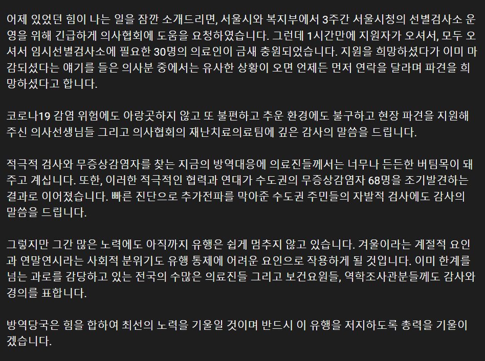 https://www.yna.co.kr/view/AKR20201217118600530 https://www.yna.co.kr/view/AKR20201216087400004 고맙습니다. 선의와 봉사자에 의존하지 않을 수 있어야 할 터인데. 오늘 발표로는 60세 이상 확진자가 전체의 30.1%라고 합니다. 그래도 감염 경로 중 지인모임을 통한 감염은 감소 추세라고 하는군요. https://youtu.be/D6uL8vPbPgc https://youtu.be/TAS4B56I_OM https://youtu.be/i0RnTHAPkpM https://youtu.be/p2HV58aYT-A https://youtu.be/dgf_sOqOyT4 2