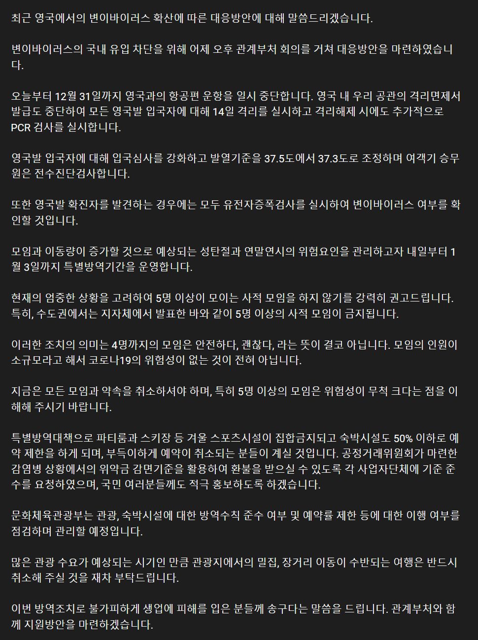 갑작스런 전세계의 입국 제한 조치에 일본, 홍콩 등도 연말 귀국이 막히면서, 직항편은 전에 비해 많지 않지만, 아직 뚫려있는 우리나라로 와서 2주 격리한다는 경우도 있었는데, 우리나라도 일단 공관의 격리면제서 발급을 중단하고, 31일까지 항공편 일시 중단 조치에 들어간다고 합니다. 그래도 입국하는 사람들은 발열 기준을 낮춰서 유증상자로 분류되면, 자택격리가 아닌 시설 격리가 가능하게 하고, 확진자 발견시는 유전자 증폭 검사를 통해 변이 바이러스 감염여부를 확인한다고 합니다.