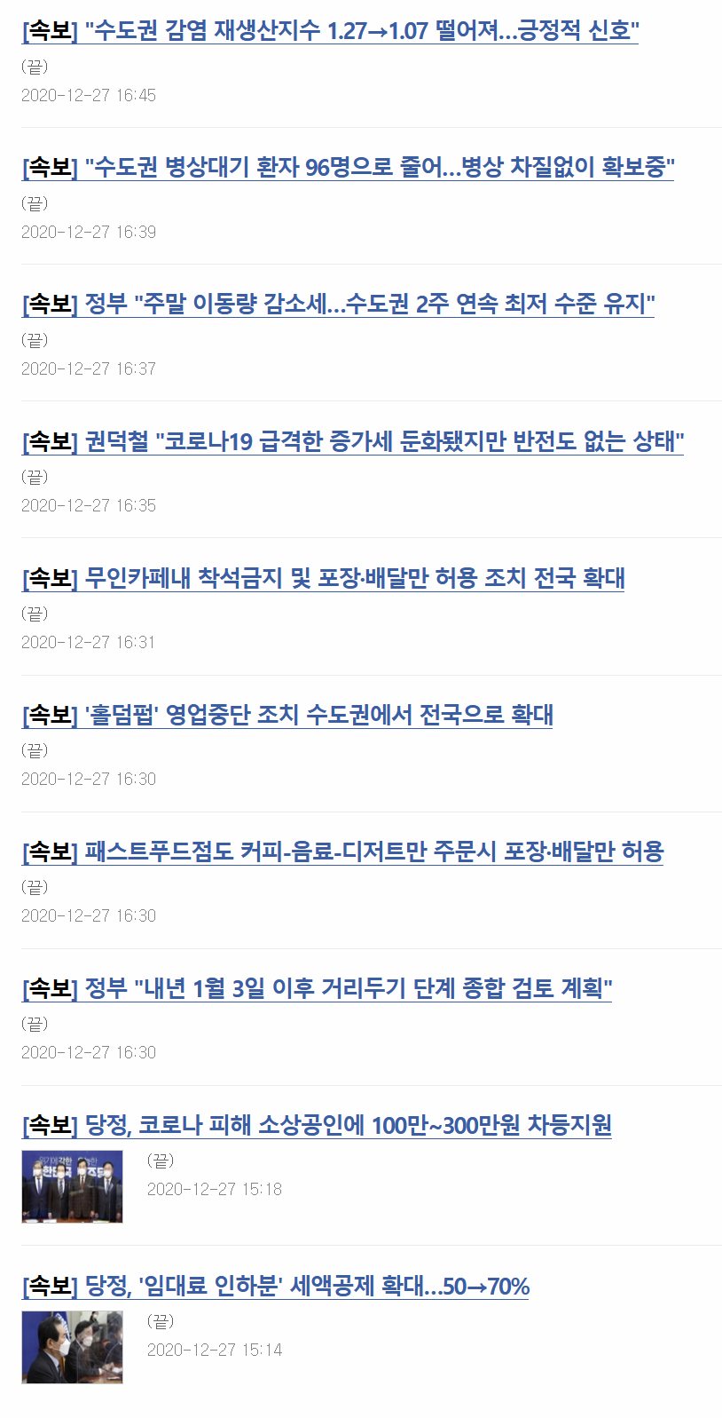 오늘 권덕철 장관의 브리핑 데뷔였는데, 역시나 3단계 예고가 며칠 전까지 없었기에 예상이 되었지만, 3단계는 안 가고, 2.5단계 연장에, 일부 조치들은 수도권 외 지역으로도 확대 적용한다고 합니다. https://www.yna.co.kr/view/AKR20201227040551530 *종합기사로 수정했습니다. https://www.yna.co.kr/view/AKR20201227033651060 https://youtu.be/HsVCjBeExE0 ===== 보도자료 올라왔습니다. https://www.mohw.go.kr/react/al/sal0301vw.jsp?PAR_MENU_ID=04&MENU_ID=0403&page=1&CONT_SEQ=362656 0