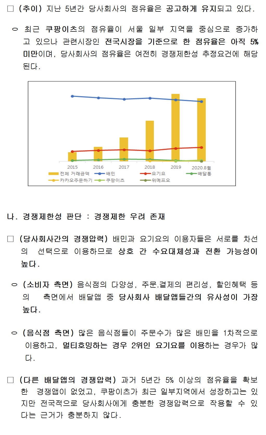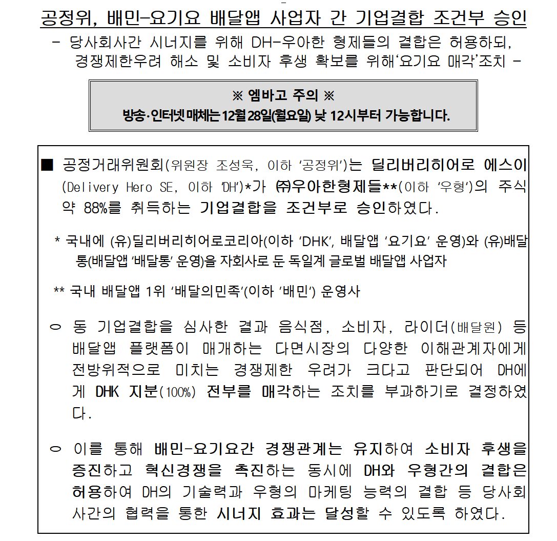 https://www.yna.co.kr/view/AKR20201228053700030 https://www.yna.co.kr/view/AKR20201228049400002 배달의 민족-요기요 기업결합 건 조건부 승인 https://www.ftc.go.kr/www/selectReportUserView.do?key=10&rpttype=1 음식배달 시장은 탐 나지만, 덥석 사기에는 시장 점유율이나 시장 상황 등에 비해 부담스러운 가격. DH 입장에서는 그래도 배민 먹고 요기요 파는 게 나아서 바겐세일(?) 할지도?? 0