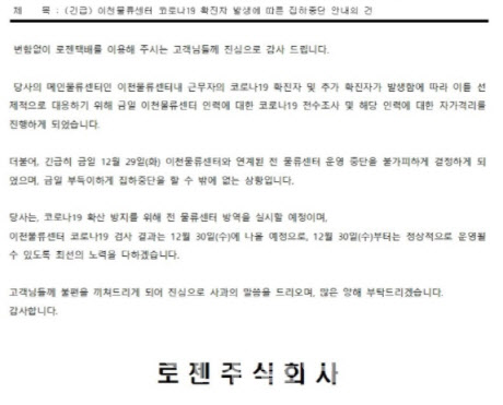 | Subject | 로젠택배 이천물류센터서 21명 집단감염…택배 지연 불가피 |