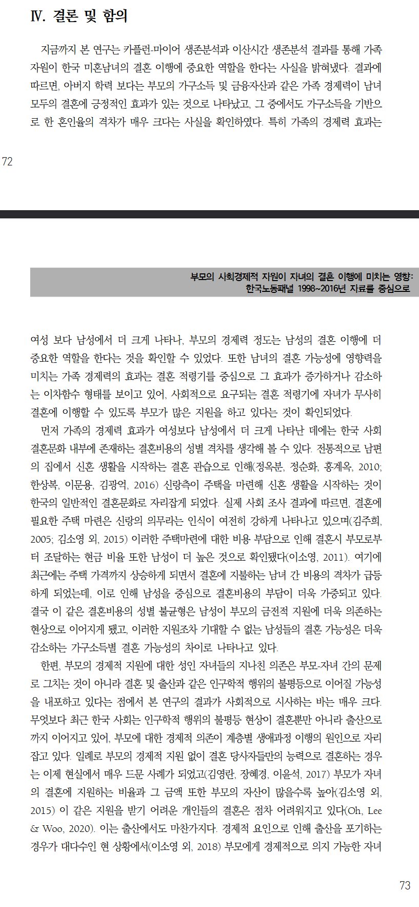 오지혜, 2020, "부모의 사회경제적 자원이 자녀의 결혼 이행에 미치는 영향:한국노동패널 1998~2016년 자료를 중심으로",보건사회연구40(4), 050-081.