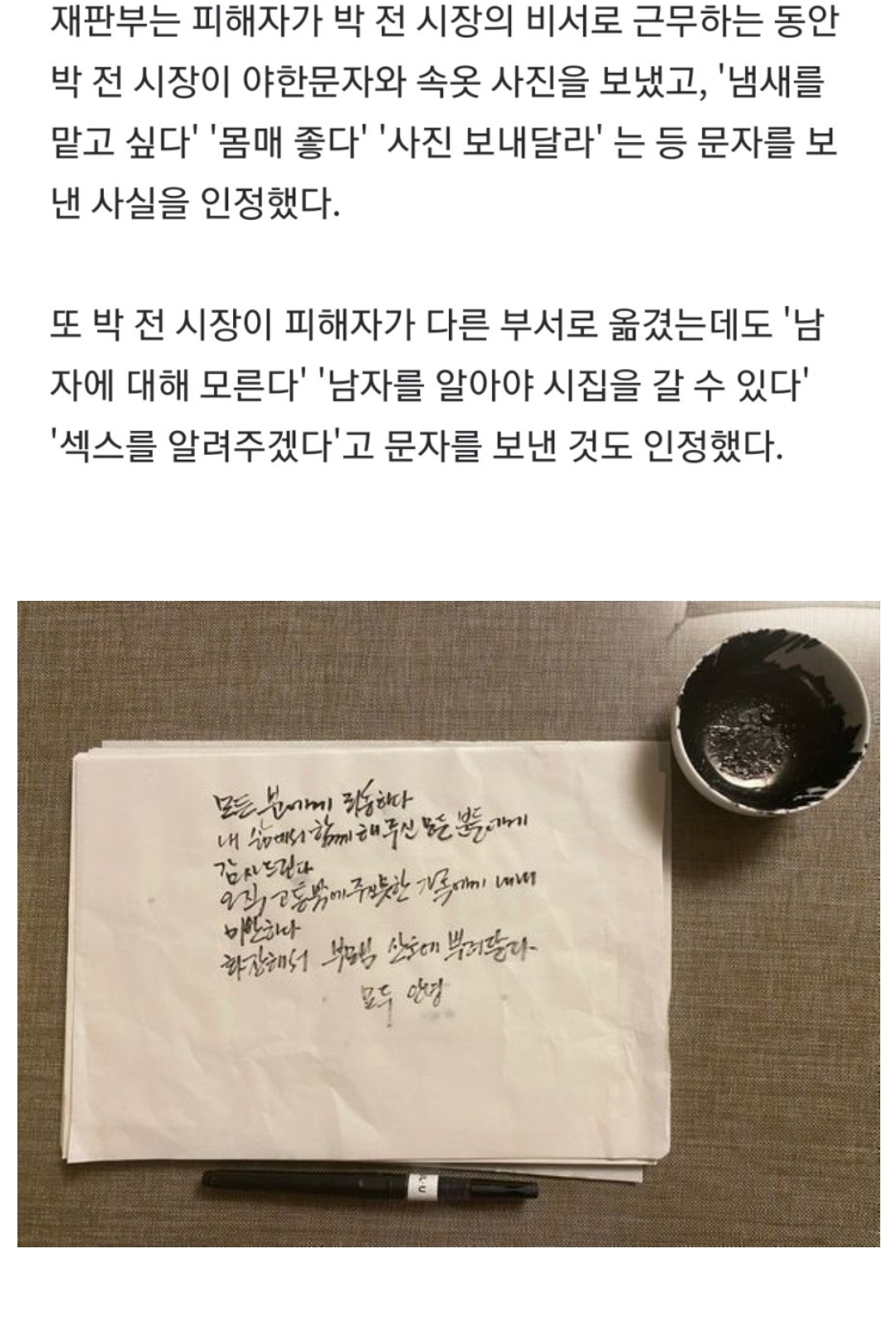 https://news.mt.co.kr/mtview.php?no=2021011410472758476 서울중앙지법 형사합의31부(부장판사 조성필)는 14일 준강간치상 혐의로 기소된 서울시장 비서실 전 직원 정모씨에게 징역 3년 6개월을 선고하고 40시간 성폭력치료프로그램 이수를 명령했다. 이날 재판부는 피해직원 A씨가 외상후스트레스장애(PTSD)를 겪은 것과 관련해 박 전 시장의 성추행 사실도 언급했다. A씨 상담 내용을 토대로 볼 때 박 전 시장 성추행 사실이 인정된다는 내용이다. "A씨는 이 사건 발생 이후에 지난해 5월부터 내원해 정신과 상담과 약물치료를 받았고 지난해 11월까지도 계속 치료를 받으며 자신이 겪었던 일을 여러 취지로 진술했다. 병원 진술 내용에 비춰보면 A씨는 지난해 5월부터 박 전 시장의 성추행 사실을 진술하기 시작했던 사실을 인정할 수 있다. 주요 내용 중 하나는 '박 전 시장 밑에서 근무한 지 1년 반 이후부터 야한 문자, 속옷 차림 사진을 보냈고 냄새를 맡고 싶다든지 사진을 보내달라는 등 문자를 받았다'는 내용이 있다. 2019년 1월경 다른 부서로 이동했는데도 다음달인 2월에 '남자를 너무 모르니 알려주겠다' 이렇게 얘기하면서 성관계 이야기를 했다는 식의 여러 차례 진술이 있었다." 이전에 떠돌던 유출본 그대로네요.. 2