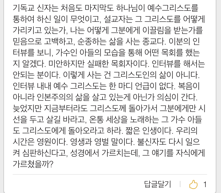칭찬이랍시고 잘자랐다면서 가수 본인의 말과 행동을 전부 기독교나 아버지 프레임에 넣어서 해석하고 있다거나....
