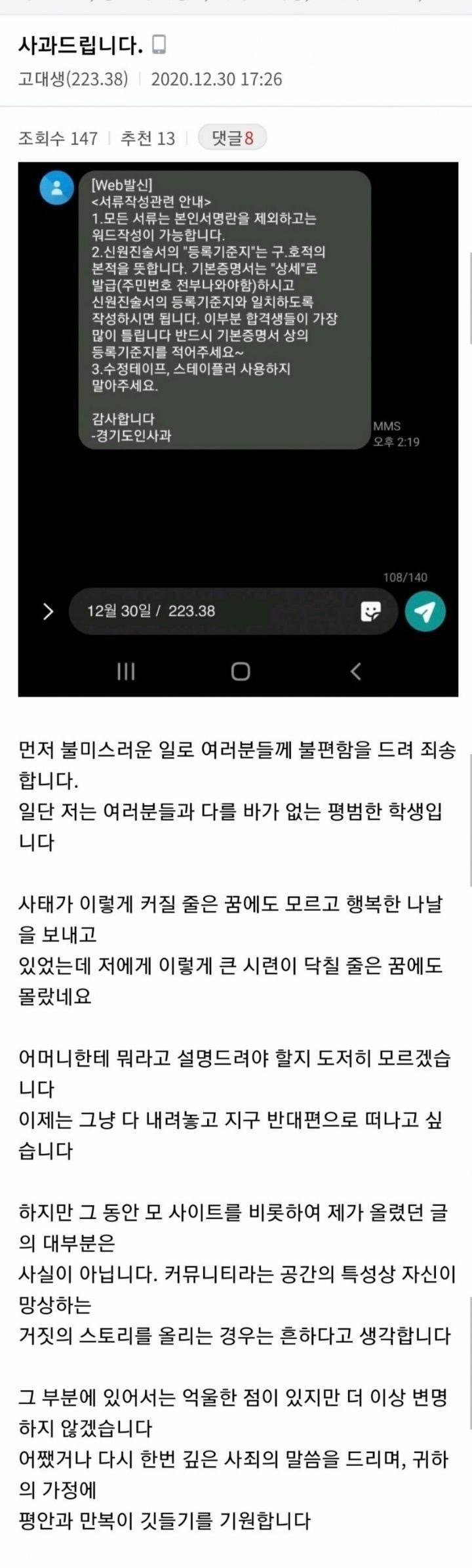 자신은 평범한 학생이고 이런 시련이 닥쳐 힘들다 변명했던데... 평범한 학생들이 여자 허벅지 도촬해 올리고 강간하고 싶다거나 미성년자 따먹었다거나 피묻은 콤돔 인증하고 장애인을 벌레취급하며 낄낄거리지 않아요. 그러면서도 시련이라 억울해하는 게 신기할 따름.