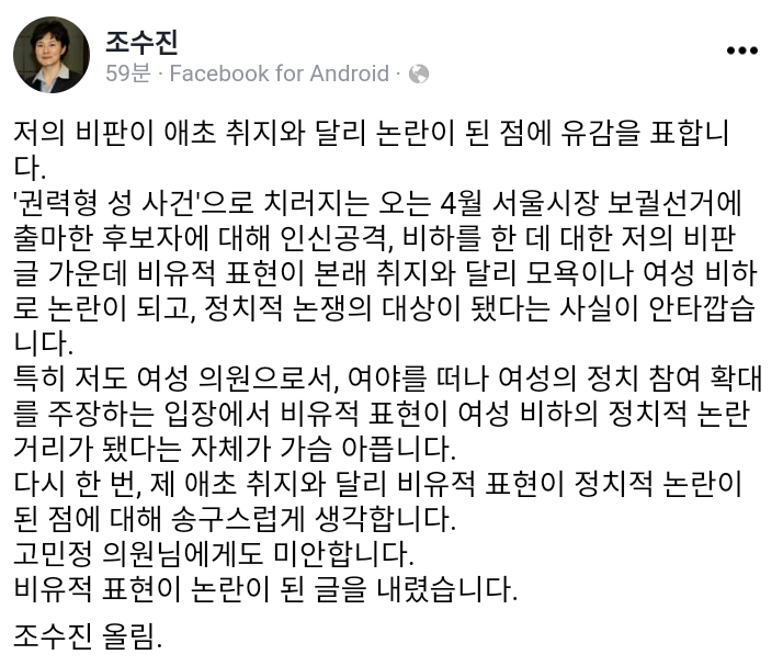 | Subject | 조수진 "'고민정 후궁' 비유 논란, 가슴 아파"..결국 유감 |