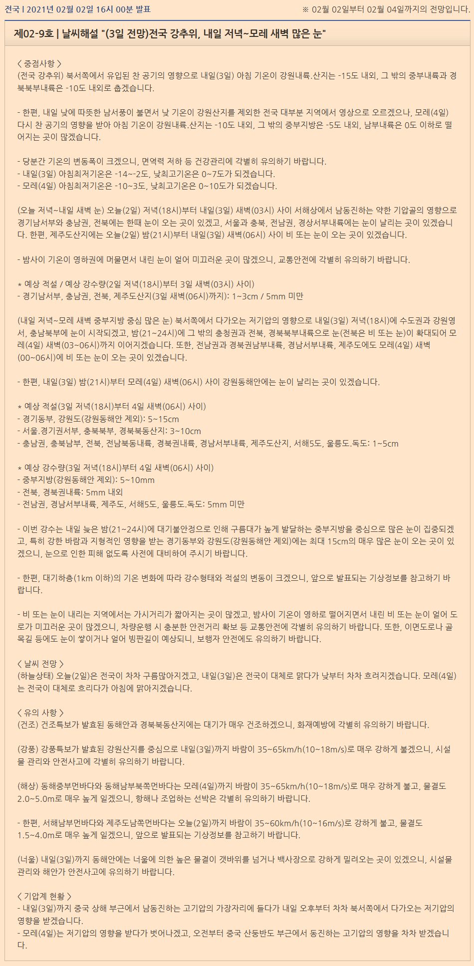 예보는 바뀔 수 있으니, 차 운행해야 하는 분들은 나중에 다시 확인해보셔야 할 것 같습니다. 지금 기상청 예보로는 내일 오후 6시 정도부터 수도권 등에 눈이 내리기 시작하고, 특히 수도권은 21시부터 24시까지 많은 눈이 집중될 것으로 예상된다고 합니다만, 바뀔 것도 같습니다.