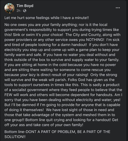 텍사스 한파로 인해 전력과 수도 공급이 중단된 상황에서 페이스북에 위와 같은 글을 썼네요.